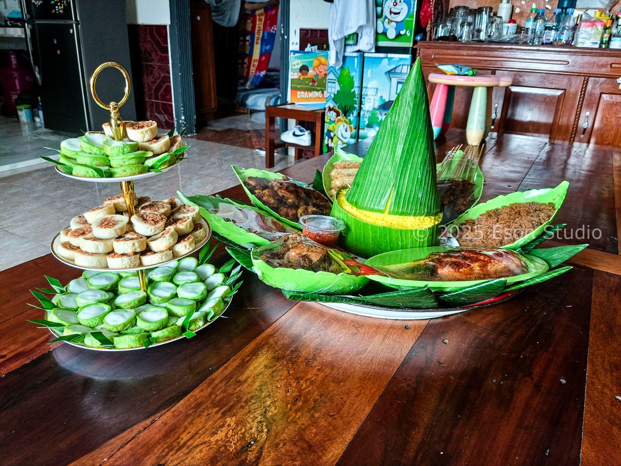 Foto ini (asumsi menampilkan suasana perayaan) memperlihatkan meja makan yang telah dihias meriah dengan fokus utama Tumpeng Ulang Tahun. Tumpeng kuning menjulang tinggi, melambangkan harapan dan syukur, dikelilingi lauk pauk yang lezat, siap untuk dinikmati bersama keluarga. Keunikan perayaan semakin terasa dengan adanya tempat makan ala Bali, mungkin berupa wadah saji atau dekorasi khas, yang menambah sentuhan eksotis dan berbeda pada acara ini.